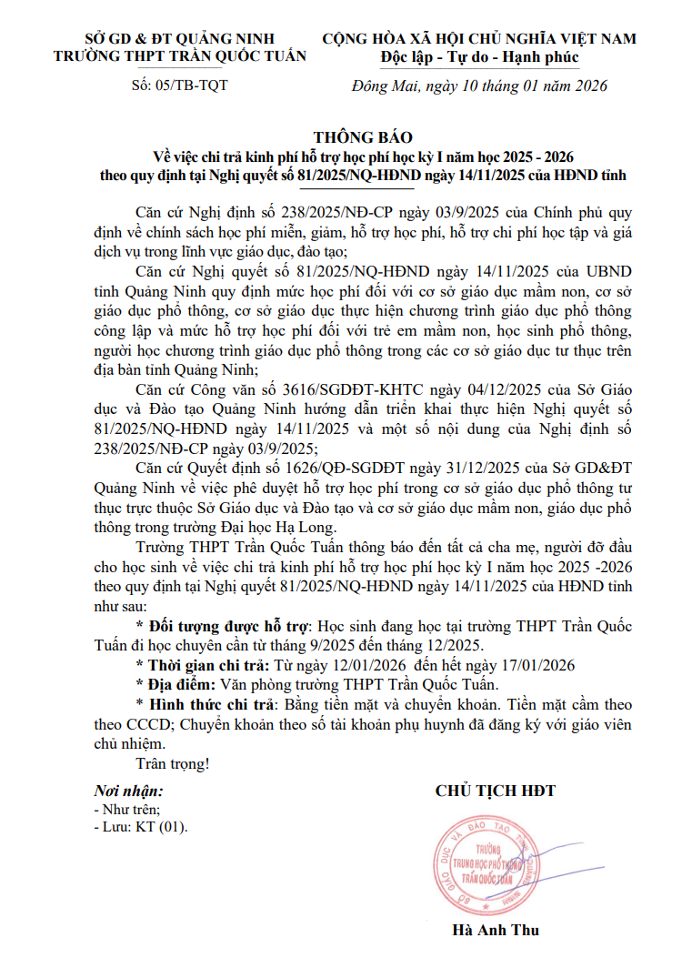 Số: 35 /TB-TQT ngày 25 tháng 4 năm 2025 Trường THPT Trần Quốc Tuấn thông báo tuyển sinh năm học 2025 -2026