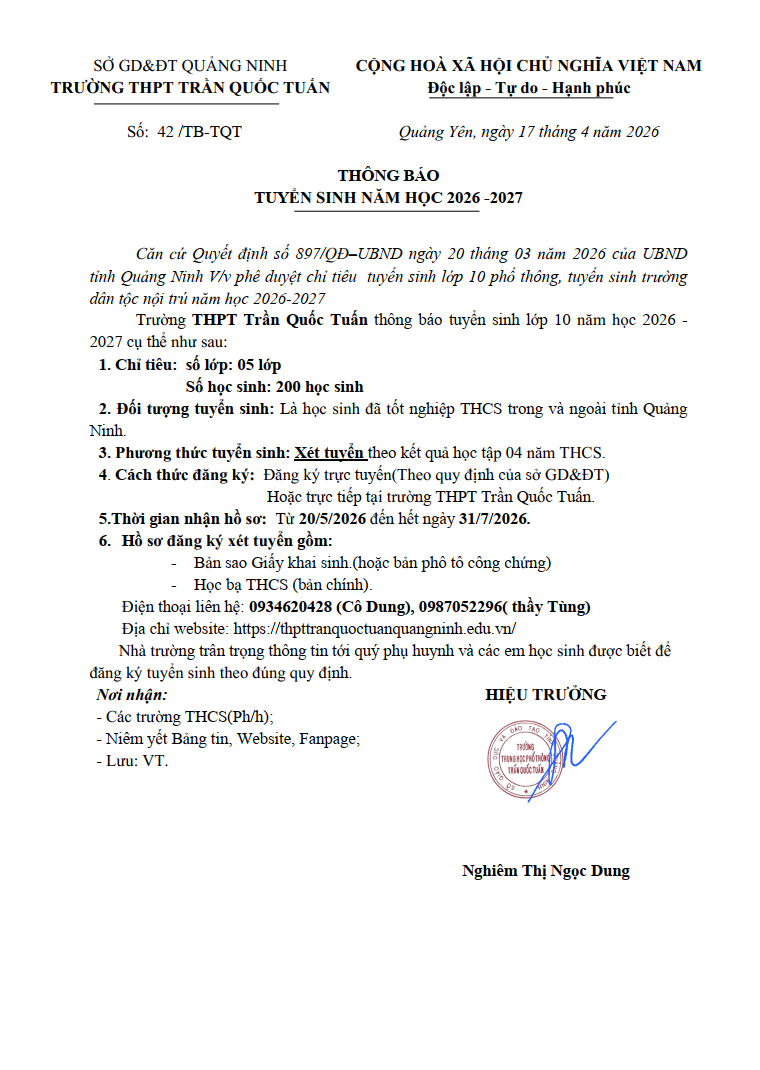 Số: 35 /TB-TQT ngày 25 tháng 4 năm 2025 Trường THPT Trần Quốc Tuấn thông báo tuyển sinh năm học 2025 -2026